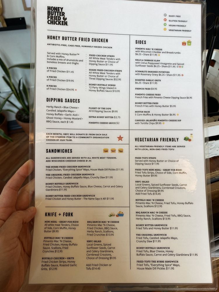 Introducing the menu at Honey Butter Fried Chicken in Chicago, IL, where you can indulge in delicious fried chicken made from antibiotic-free, cage-free, and humanely raised chicken. The menu offers a variety of options, including 2-piece, 4-piece, and 8-piece fried chicken meals served with honey butter and corn muffins. Monthly specials like the Schmaltz Matzo Ball and Chicky Chicky Parm Parm are also available for a limited time. Diners rave about the juicy chicken tenders, sweet cornbread bites with honey butter, and the unique blood orange lemonade. The restaurant provides a hip and fun atmosphere with outdoor seating, gender-neutral restrooms, and a full bar. With fast service, friendly servers, and a modern decor, Honey Butter Fried Chicken is a must-visit spot for brunch, lunch, or dinner.